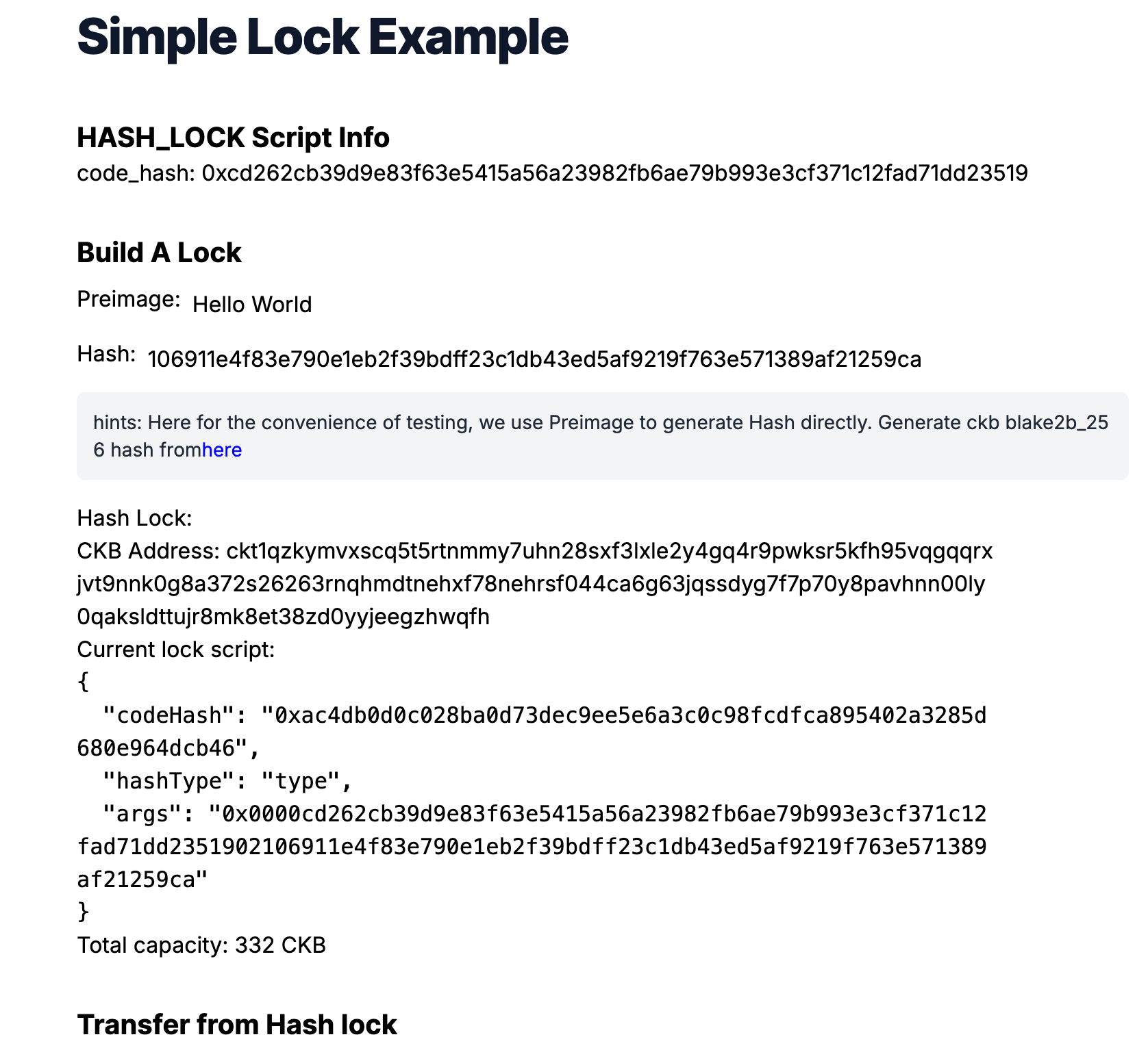 Our example dApp will use a simple toy lock. You will create a Lock Script named hash_lock to secure some CKB tokens and build a web interface for users to transfer tokens from this hash_lock.